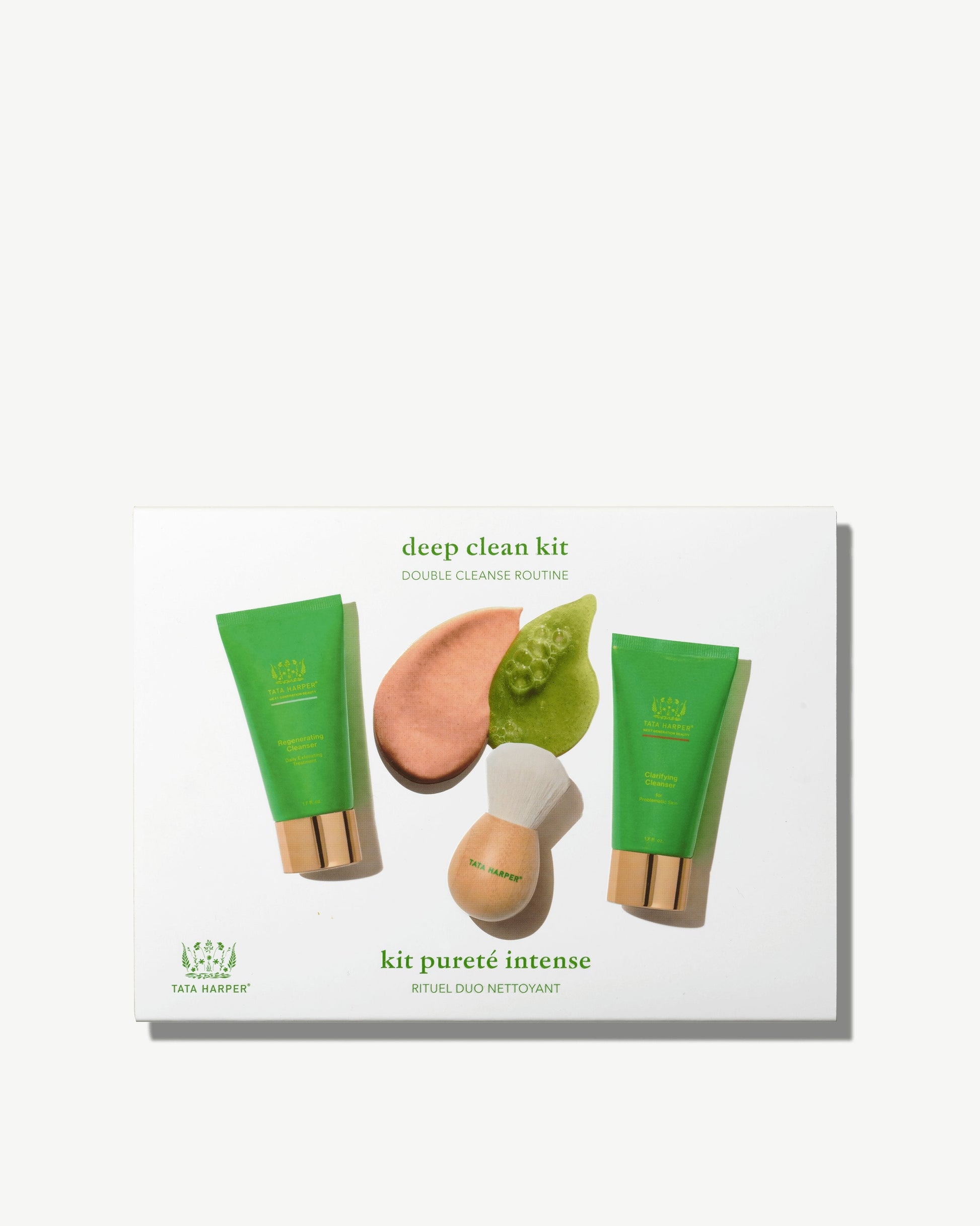 This product is: a double cleanse routine with a luxurious kabuki cleansing brush.